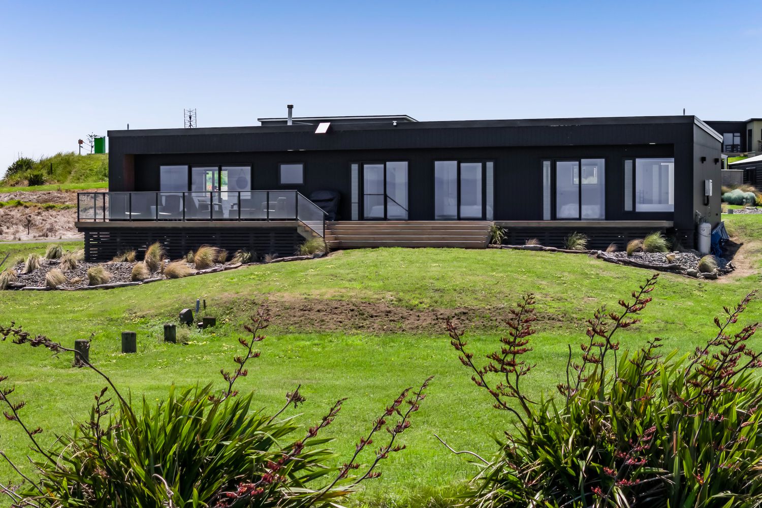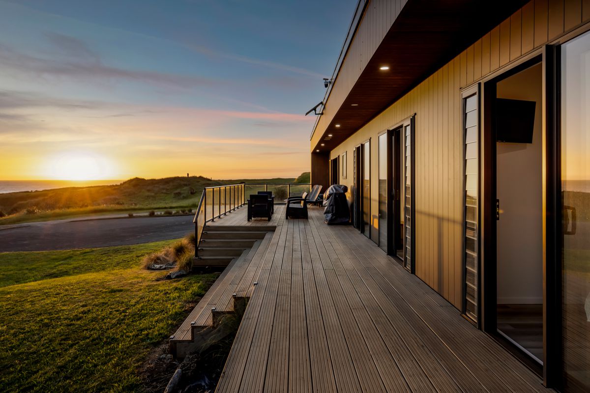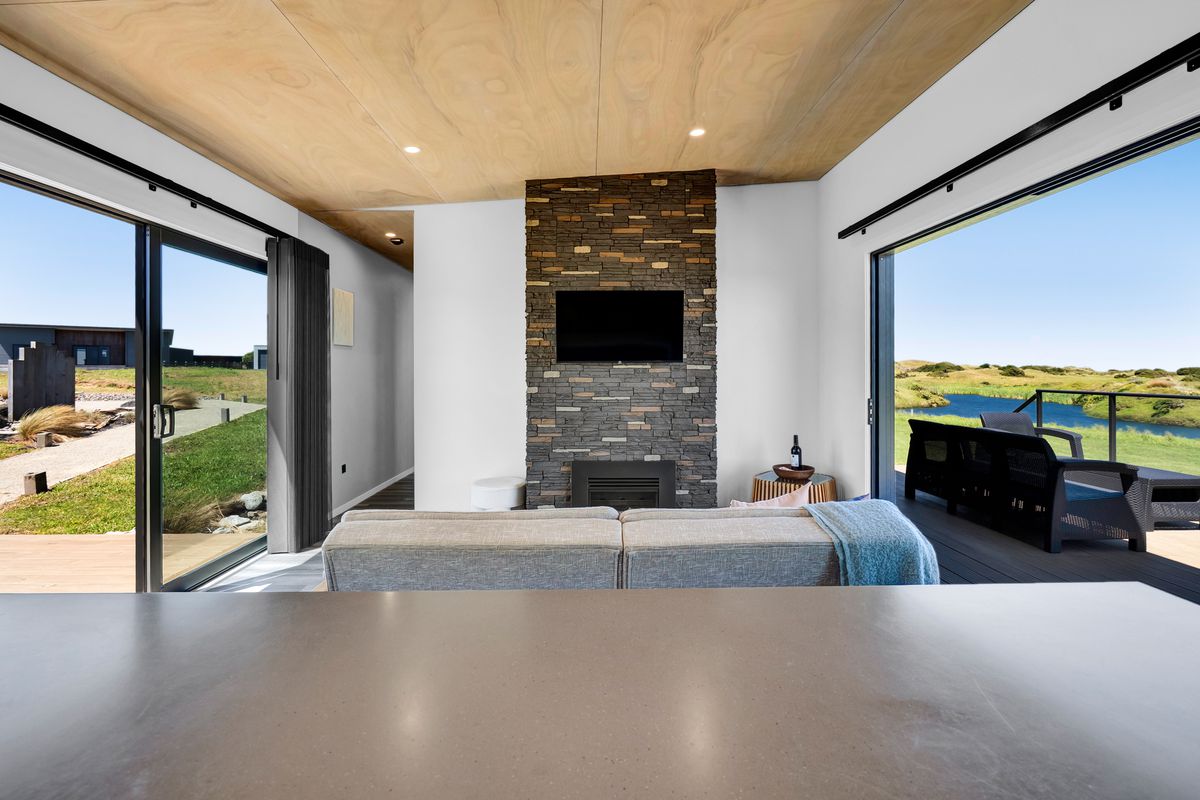 From the outside, the lodge blends nicely into its surrounding landscape through the combination of black smooth and woodgrain BCG Duragroove and extensive joinery that captures uninterrupted sea and lake views, while three generously sized bedrooms offer direct access to the expansive deck. Every room invites the outdoors in, creating seamless flow and effortless serenity.