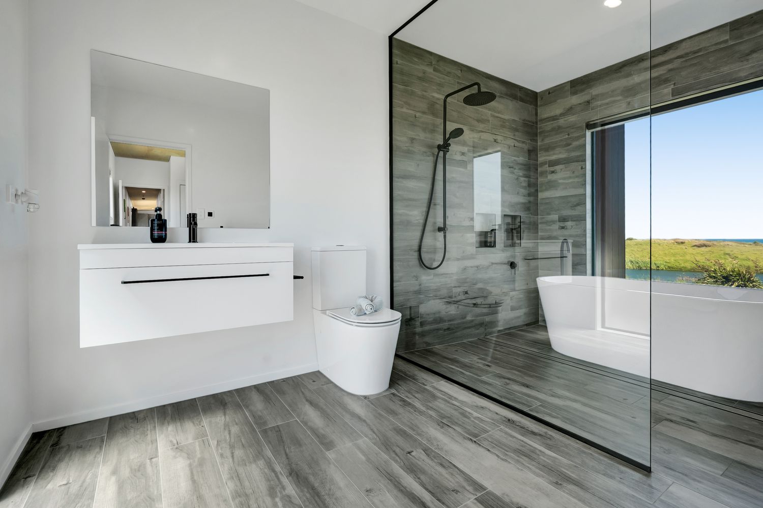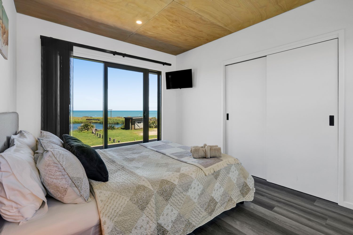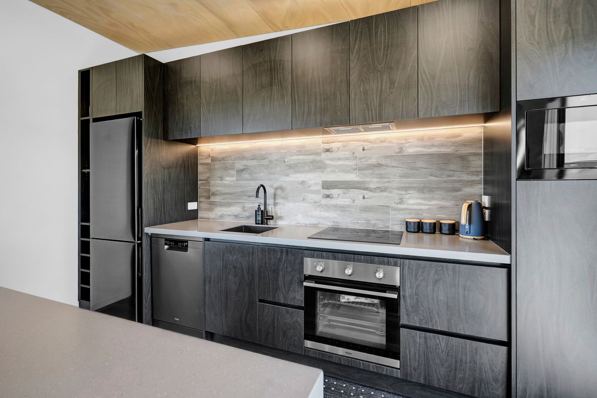 From the outside, the lodge blends nicely into its surrounding landscape through the combination of black smooth and woodgrain BCG Duragroove and extensive joinery that captures uninterrupted sea and lake views, while three generously sized bedrooms offer direct access to the expansive deck. Every room invites the outdoors in, creating seamless flow and effortless serenity.