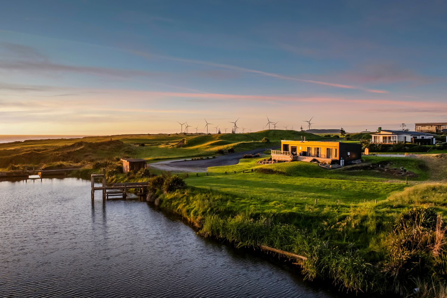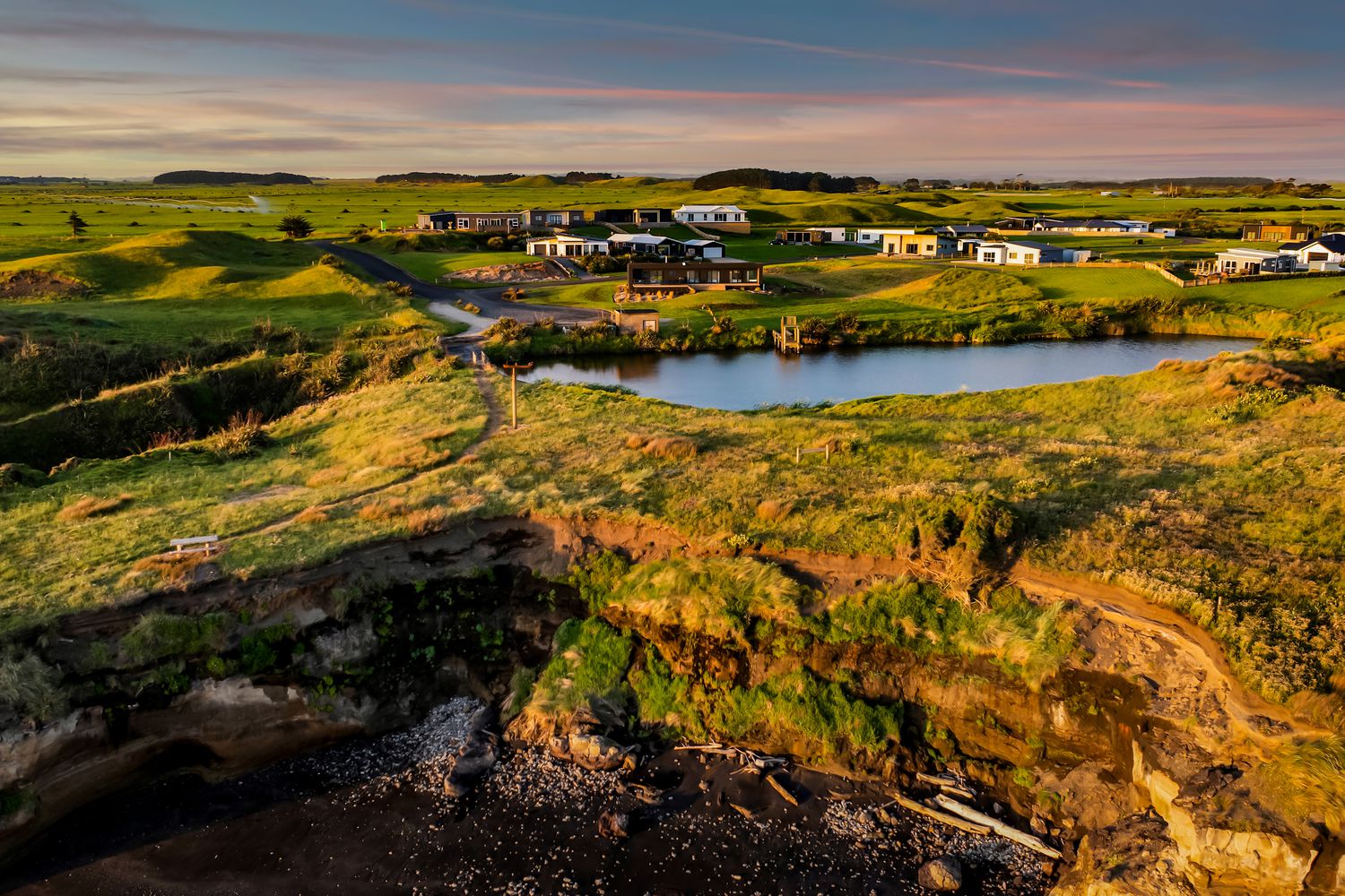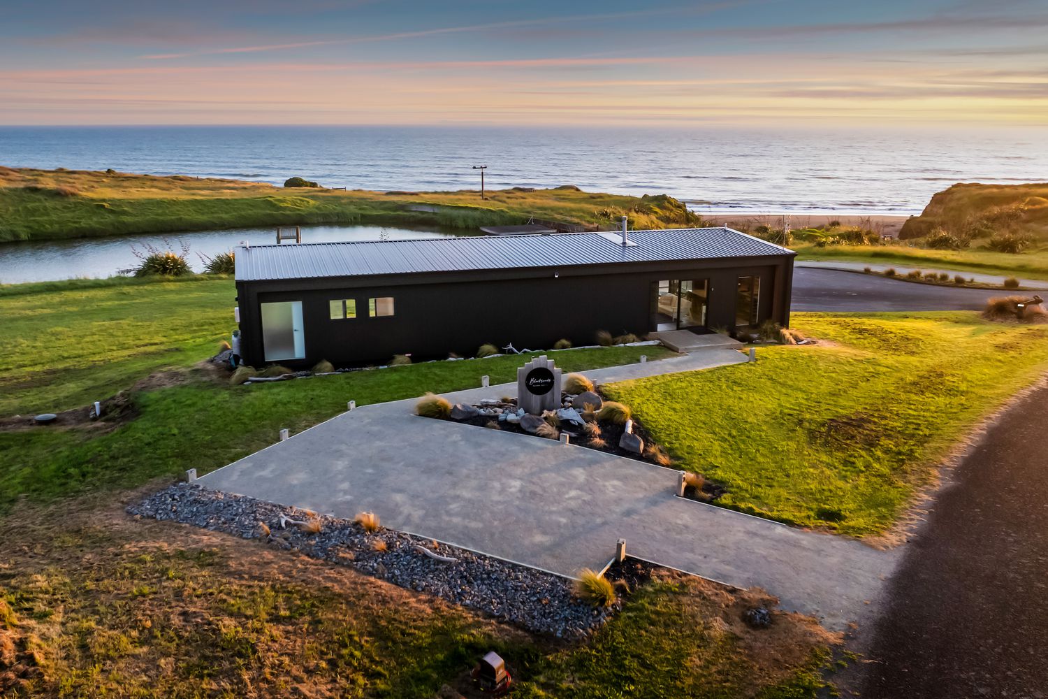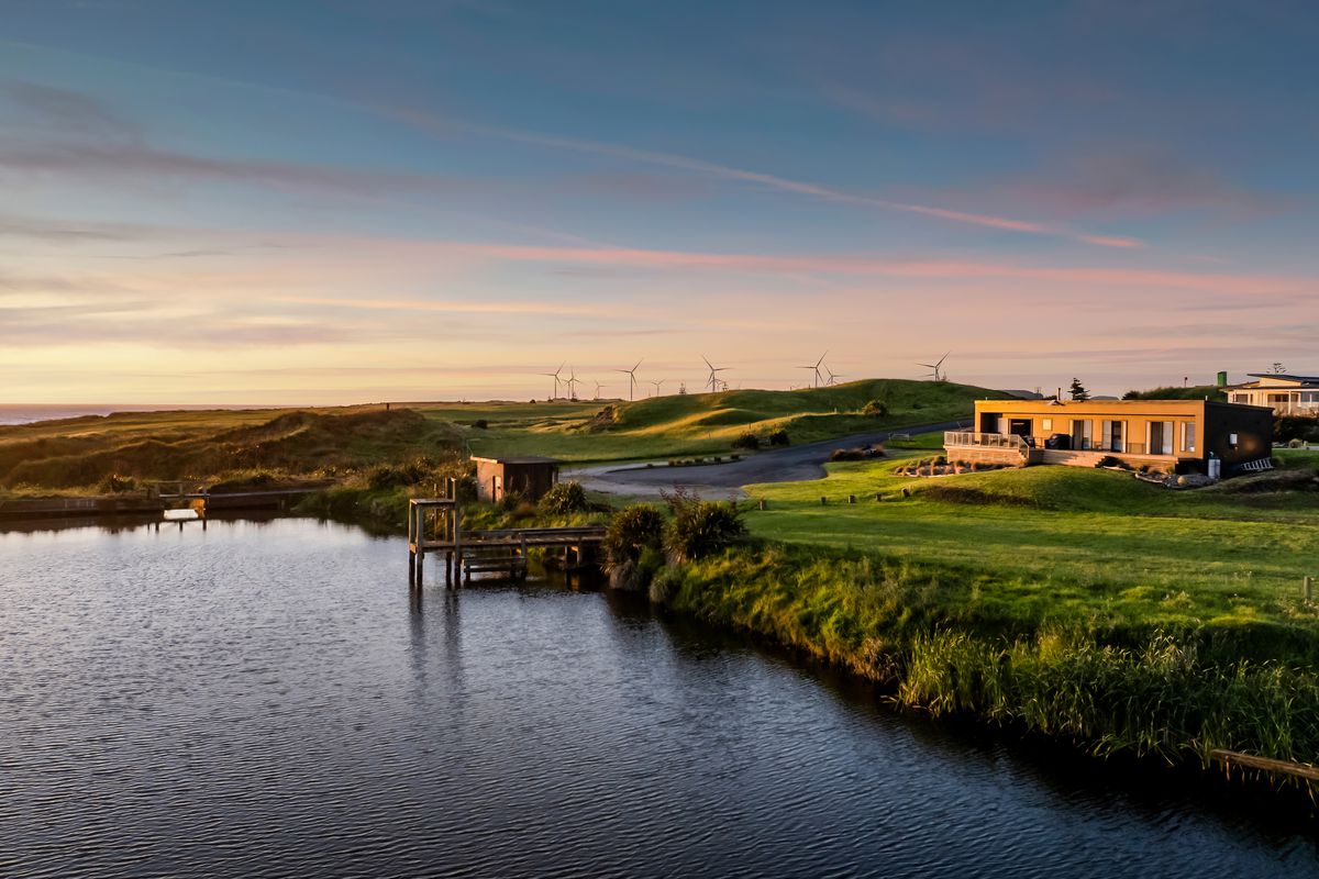 Welcome to Waipipi Beach, a hidden coastal gated sanctuary on the untamed shores of South Taranaki, where modern luxury meets raw natural beauty. Tucked between the rhythmic surf of the Tasman Sea and a serene, private lake, this extraordinary home isn’t just a property. It’s an experience, one that begins with sunrise glinting off the water, and ends with golden light bathing a freestanding tub as you soak beneath an endless sky.