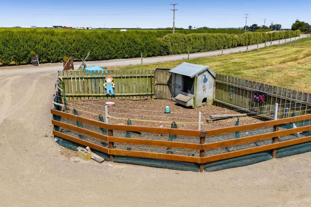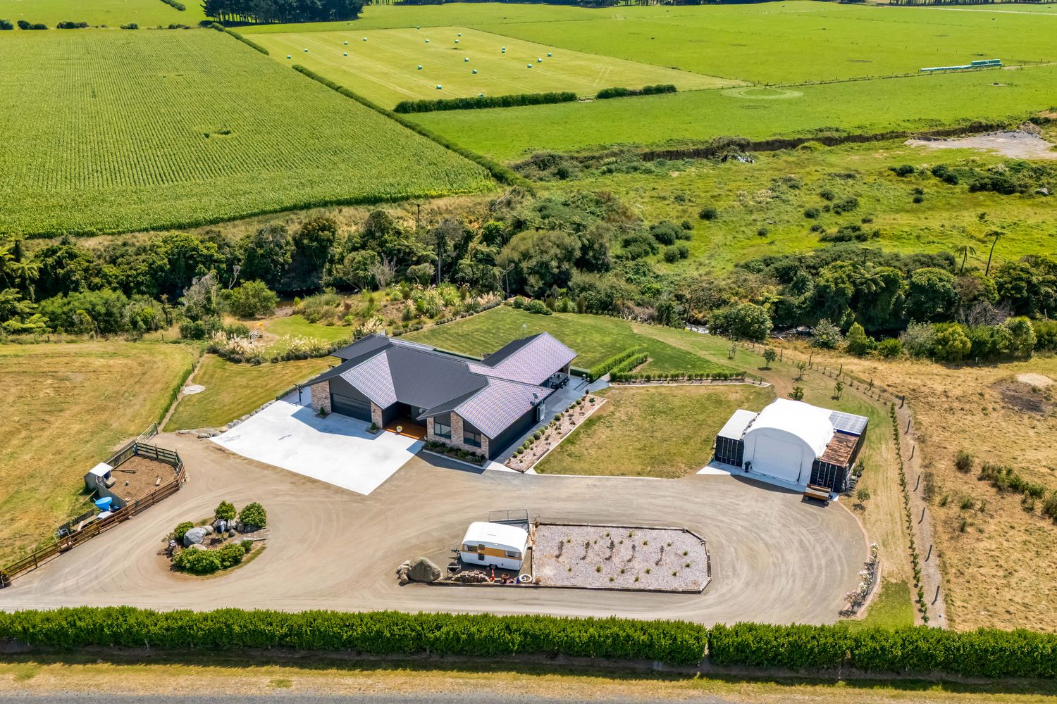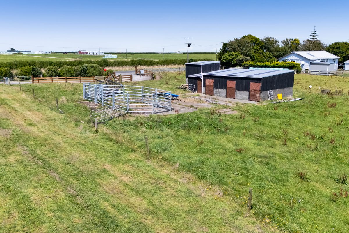 The land is well set up for lifestyle living, divided into four securely fenced paddocks with water supplied throughout via the Waimate West Water Scheme. Infrastructure is impressive, including a large plastic-covered shed with a concrete floor and power, a powered workshop, two steel shipping containers, and a repurposed cowshed offering three stables plus additional storage.