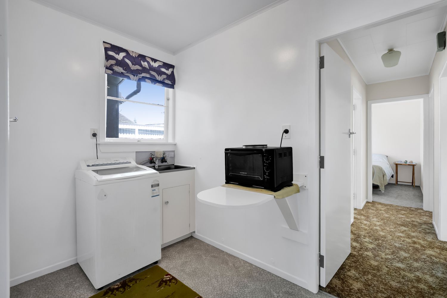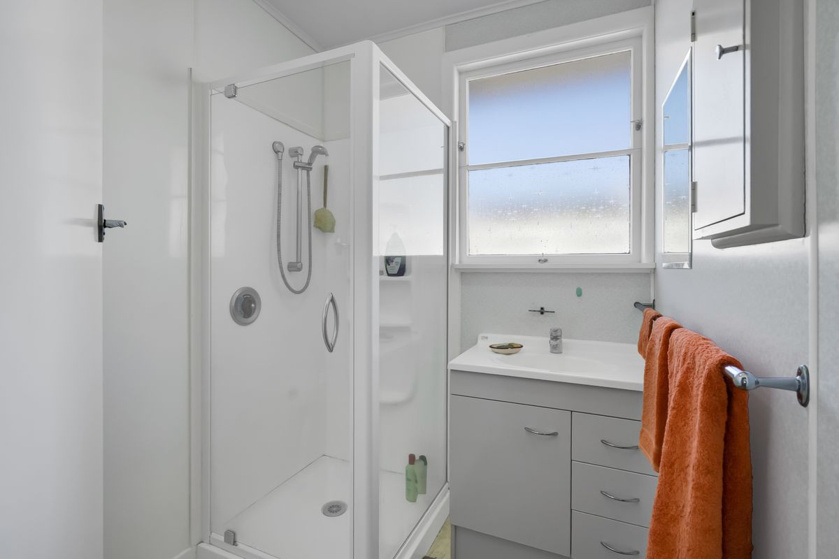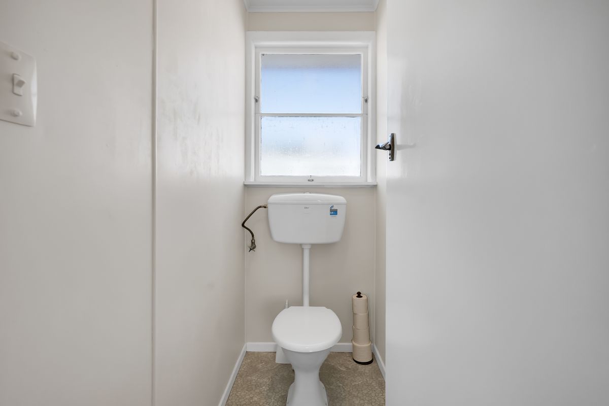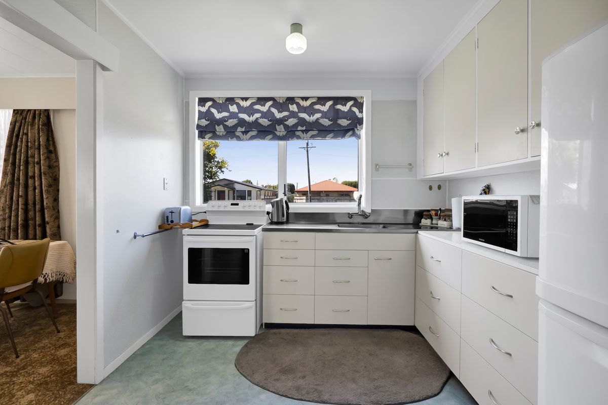 The kitchen enjoys a pleasant street outlook and has already had a gentle refresh with painted cabinetry, an electric stove, and a double-glazed aluminium window, while the remainder of the home retains timber joinery, a reminder of its era and an invitation for future ideas.