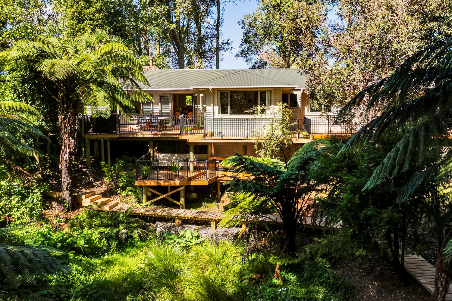 At the heart of the home, the kitchen and living areas form the main gathering wing. Well appointed with gas hobs, double ovens, and excellent storage, flowing effortlessly through to dining and multiple living zones. French doors open out to an expansive wraparound deck, one of the largest you’ll come across , perfectly positioned to capture the sun and enjoy nature. From here, that magnificent walnut tree anchors the setting, creating a scene that feels more rural than town.
